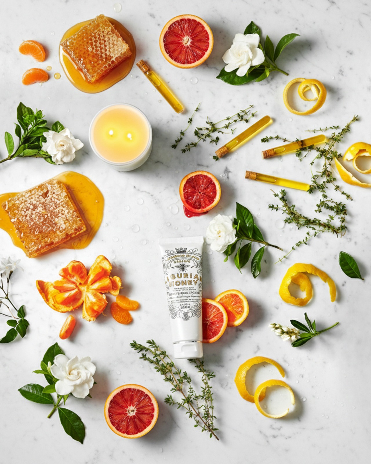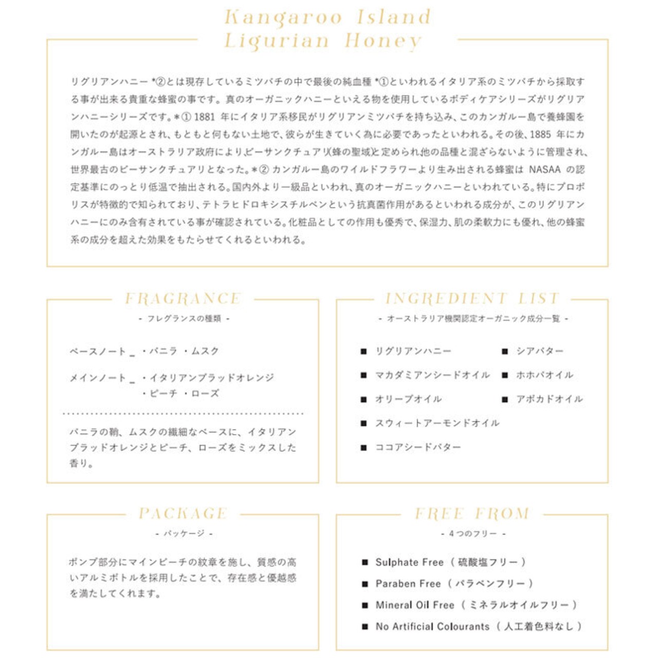 リグリアンハニー、マカダミアンシードオイル、オリーブオイル、スイートアーモンドオイル、ココアシードバター、シアバター、ホホバオイル、アボガドオイル