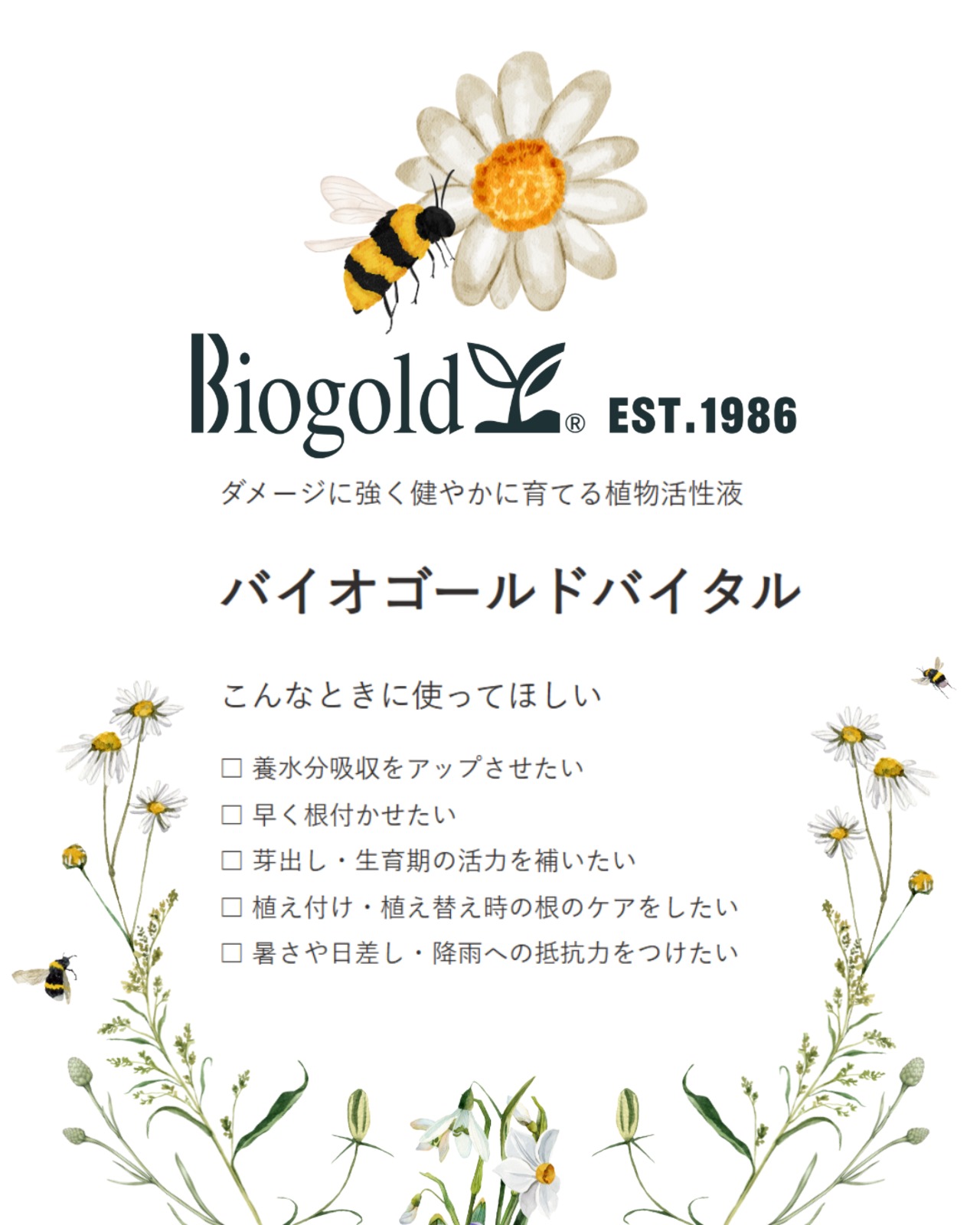 発根効果で基礎となる根をしっかり張らせます。芽出し、生育期のスタミナ強化や弱った株の樹勢回復効果もあります。