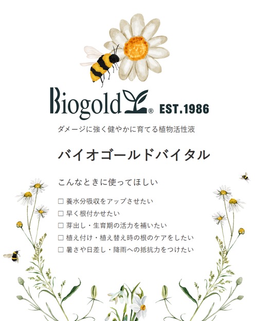 液肥や農薬ではなく「活性液」です。生育に充分な肥料分は含みません。本製品とあわせて開発しているバイオゴールドの肥料をご一緒にお使いください。